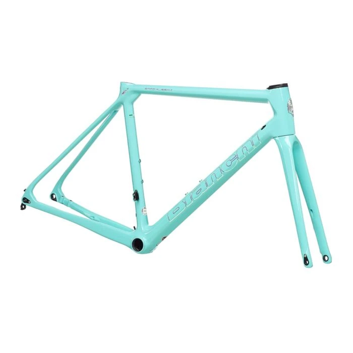 Cadre : Specialissima Disc carbon w/Bianchi CV, 1.5″ – 1.5″ headset, 27,2mm seatpost, mechanical/electronic shifting compatible, PressFit 86,5x41mm BB, internal cable routing for disc brakes, flat mount caliper, thru axle 12x142mm, sizes 47-50-53-55-57-59-61cm