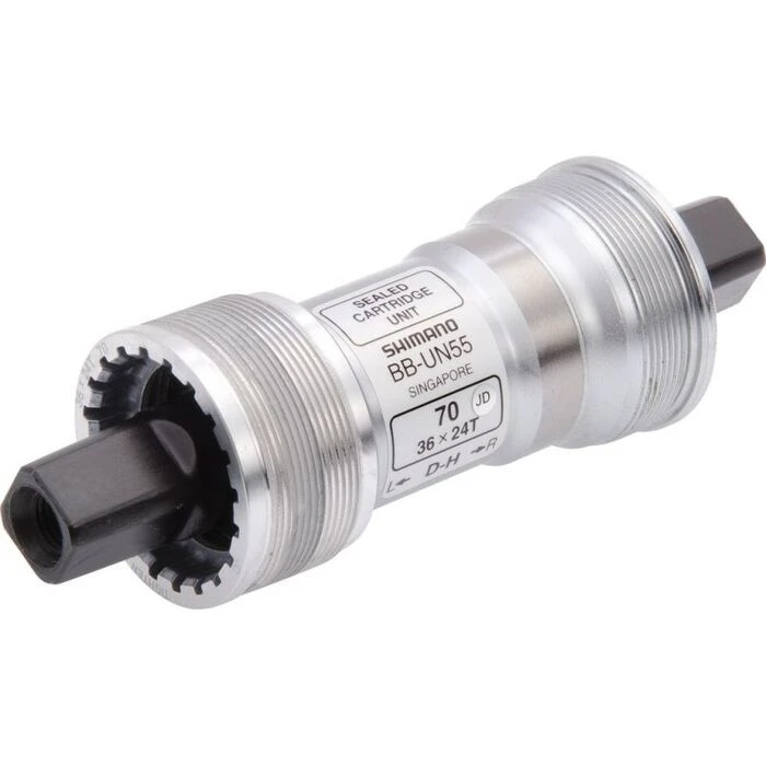 Le boîtier de pédalier Shimano BB-UN 55 de 70 mm de largeur se compose de filetage italien (36×1 mm) et d’un axe à emmanchement carré.
